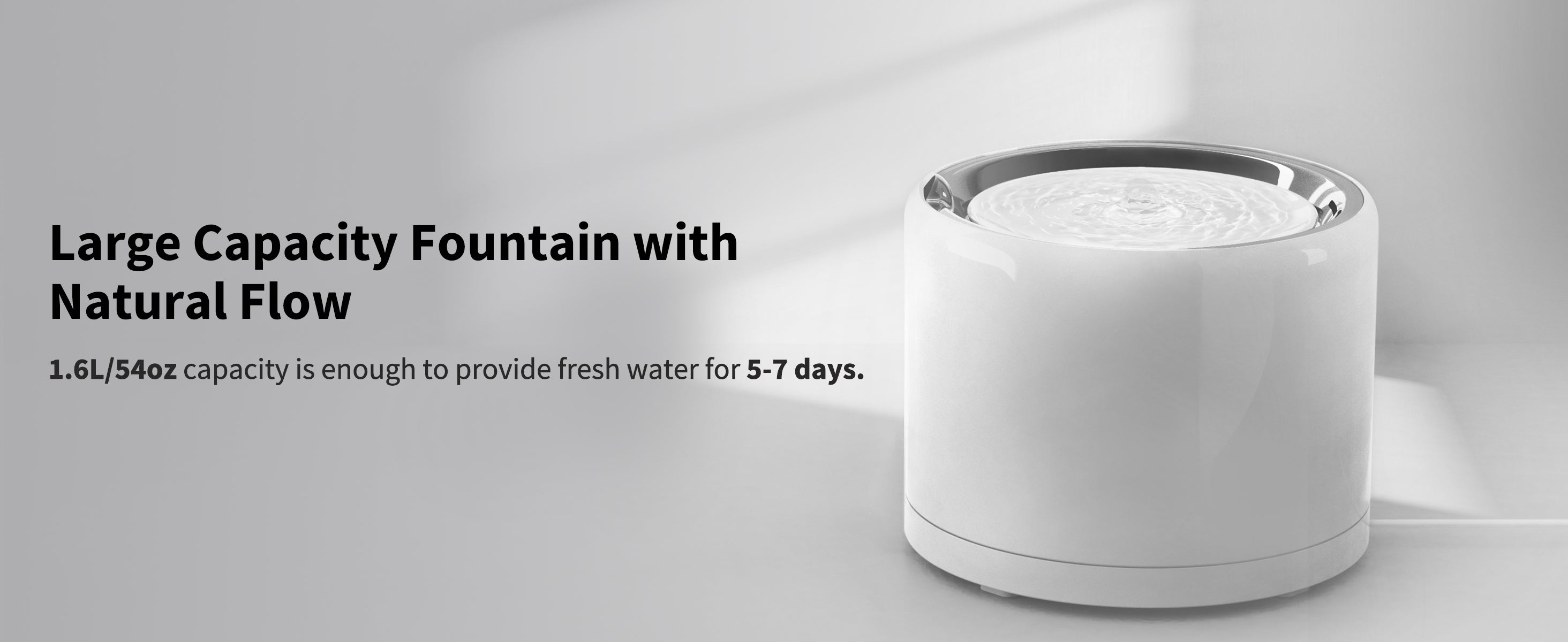 With large capacity of 54oz/1.6L, the device can provide 1-2 cats fresh water for 5-7 days. Each pet's daily water intake is different, so the water refilling frequency will vary.