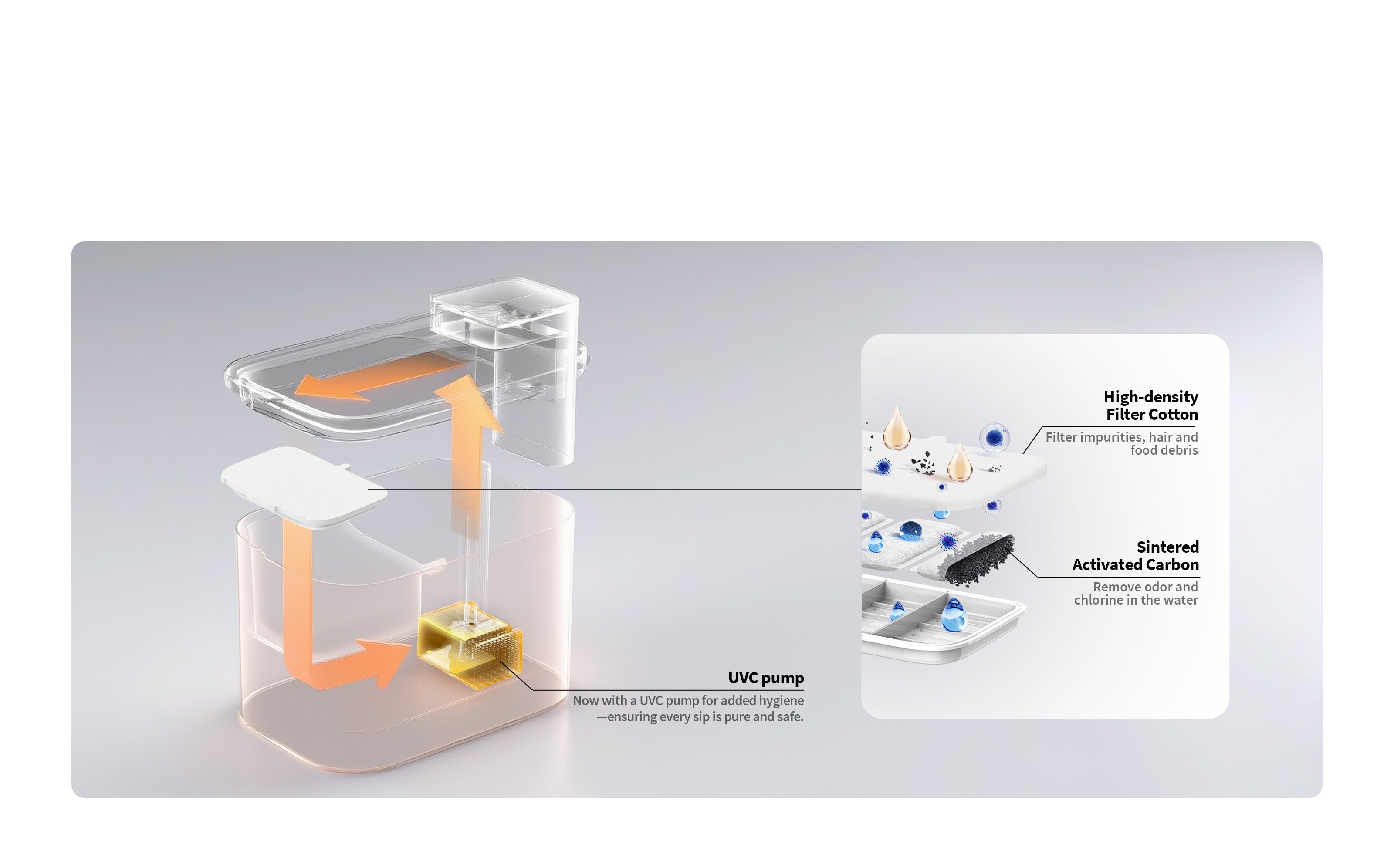 No exposed wires, auto shut-off at low water levels, and UVC protection to keep water fresh.