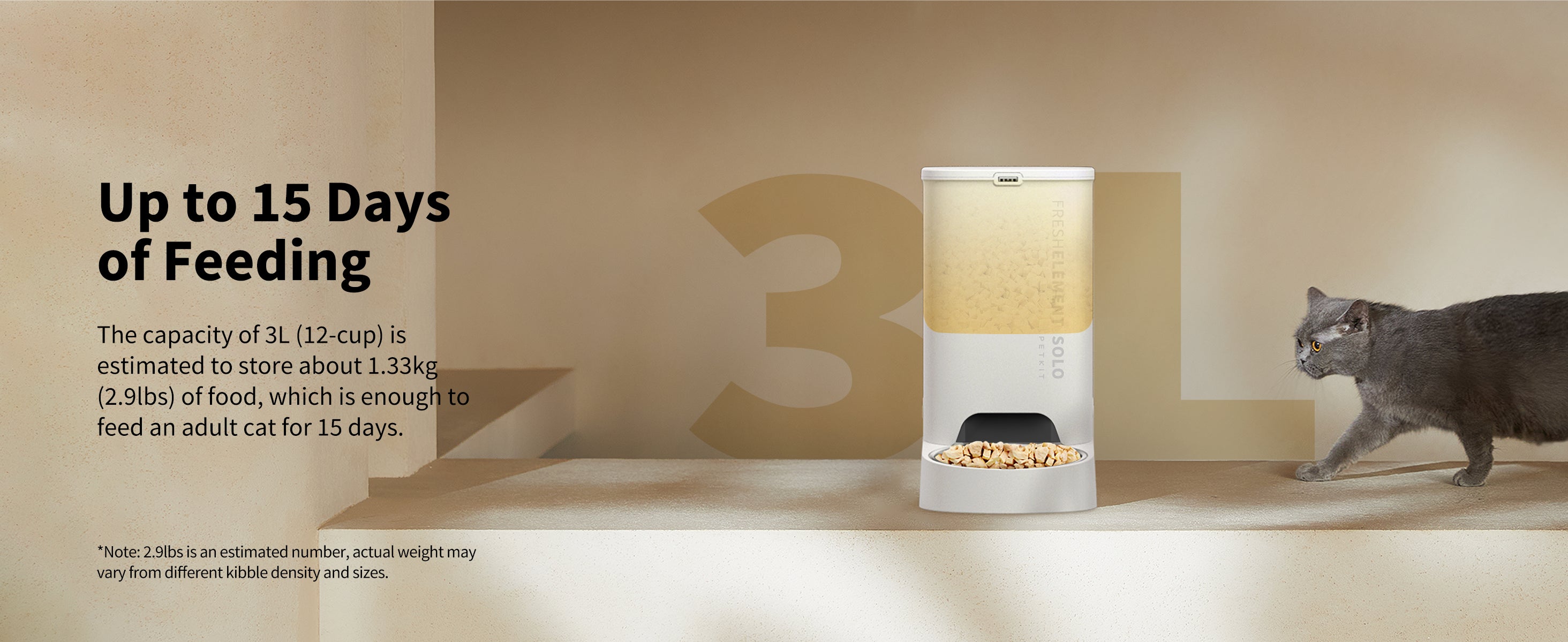 The capacity of 3L (12-cup) is estimated to store about 1.33 kg (2.9 lbs) of food, which is enough to feed an adult cat for 15 days.