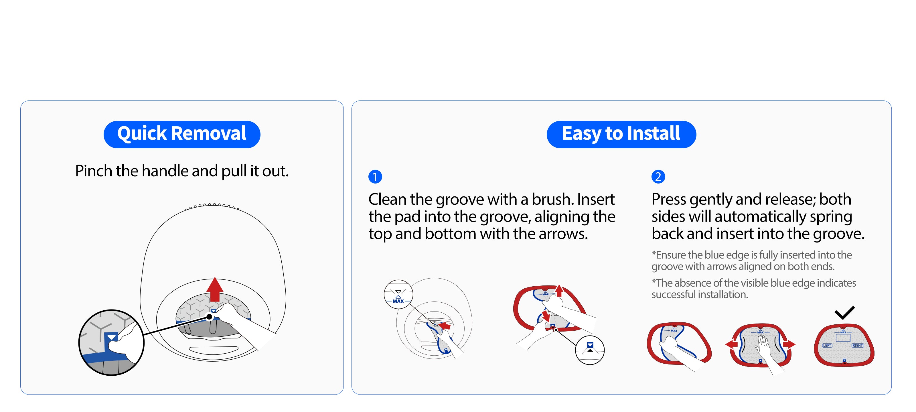 The blue elastic edge is fully inserted into the groove, remaining firm to guide urine flow along the brim structure to the pad. Avoid any leakage resulting from your cat urinating along the edge.